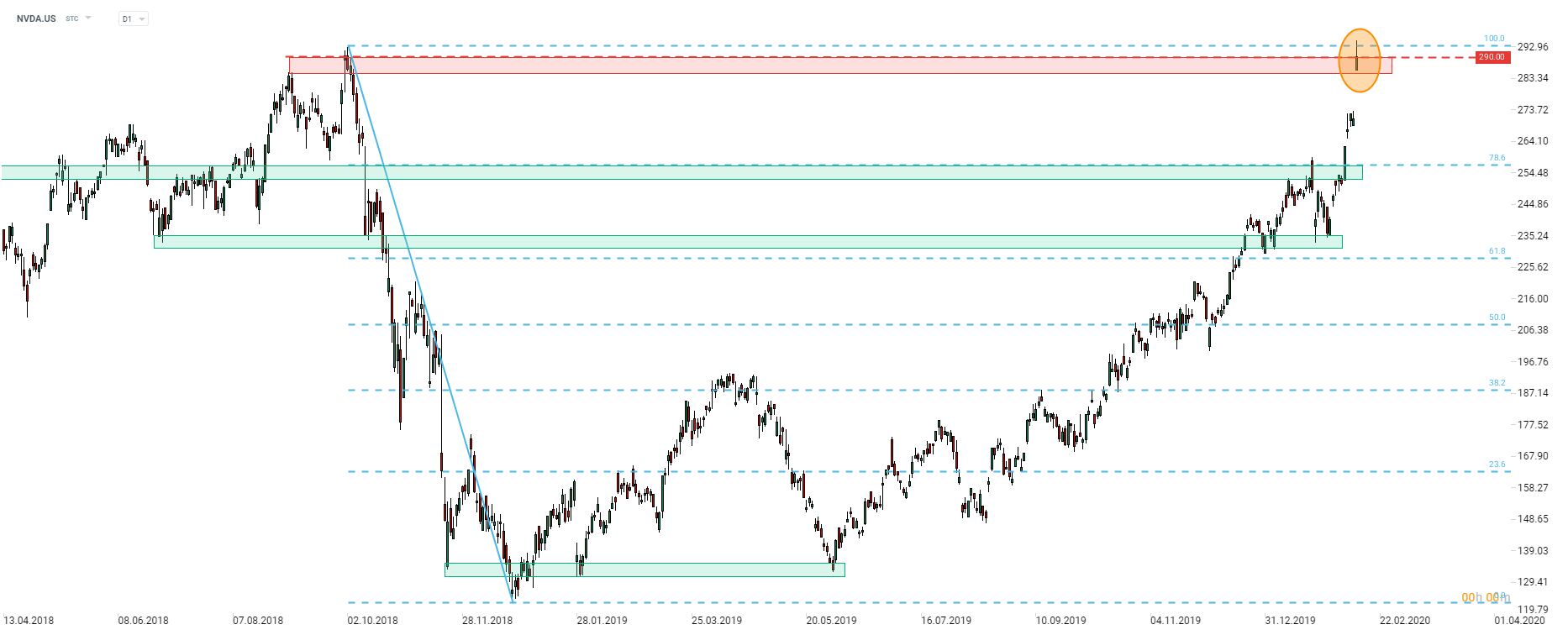 W piątek NVIDIA (NVDA.US) odnotowała silny wzrost cen akcji po publikacji wyników finansowych, które okazały się być lepsze niż prognozy. Ostrzeżenie Apple wywiera dziś presję na europejski sektor półprzewodników i oczekuje się, że sytuacja utrzyma się podczas dzisiejszej sesji amerykańskiej. Cena akcji NVIDII może być trudna do obrony po tym jak w piątek pojawiła się formacja pin bar (pomarańczowy okrąg na wykresie). Źródło: xStation5