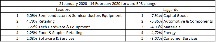 Zacznijmy od sektorów, których prognozy zysków zostały zrewidowane w dół. Na szczycie rankingu znajdują się producenci maszyn, samochodów i spółki surowcowe. Nie powinno to dziwić, ponieważ ceny surowców drastycznie spadły z obawy o epidemię, a Chiny są największym na świecie rynkiem motoryzacyjnym. W przypadku producentów maszyn, rewizja w dół również nie stanowi zaskoczenia bowiem Chiny uchodzą za “fabrykę świata” i spowolnienie gospodarcze może z łatwością rozprzestrzenić się za granicę. Jednakże lewa część powyższej tabeli - liderzy - prezentuje się w sposób mniej oczywisty.