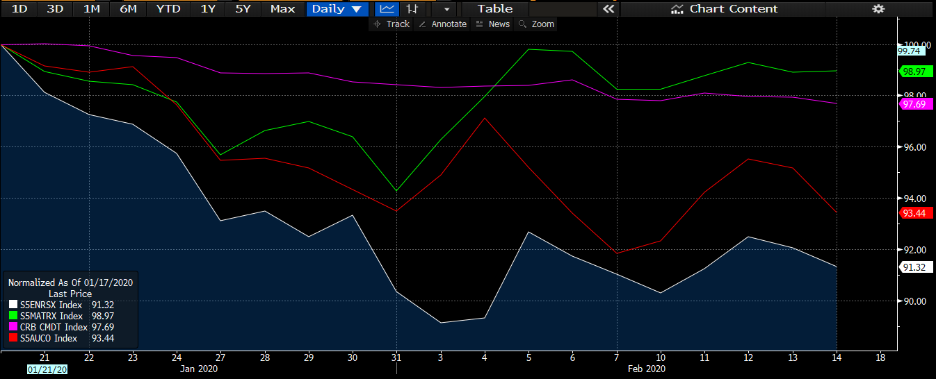 Subindeksy sektora motoryzacyjnego (czerwona linia) oraz spółek wydobywających surowce energetyczne (biała linia) gwałtownie spadły. Spółki surowcowe (zielona linia) traciły mocniej niż indeksu surowców (fioletowa linia, CRB all-commodities index), jednak straty udało się odrobić. Źródło: Bloomberg