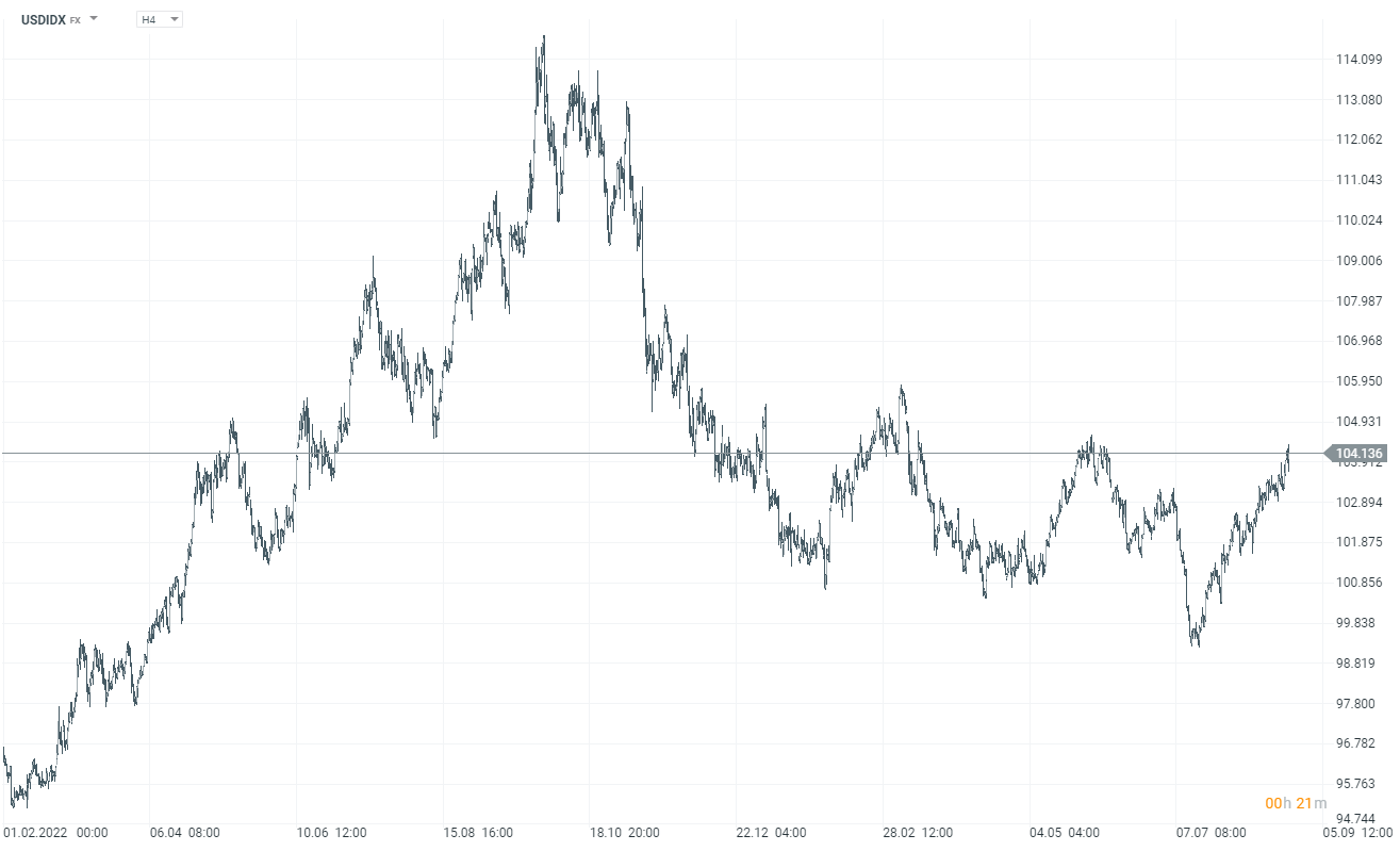 Indeks dolara (USDIDX) zyskuje dziś 0,2% i znajduje się już na poziomach lokalnych szczytów z czerwca, tego roku. Źródło: xStation5