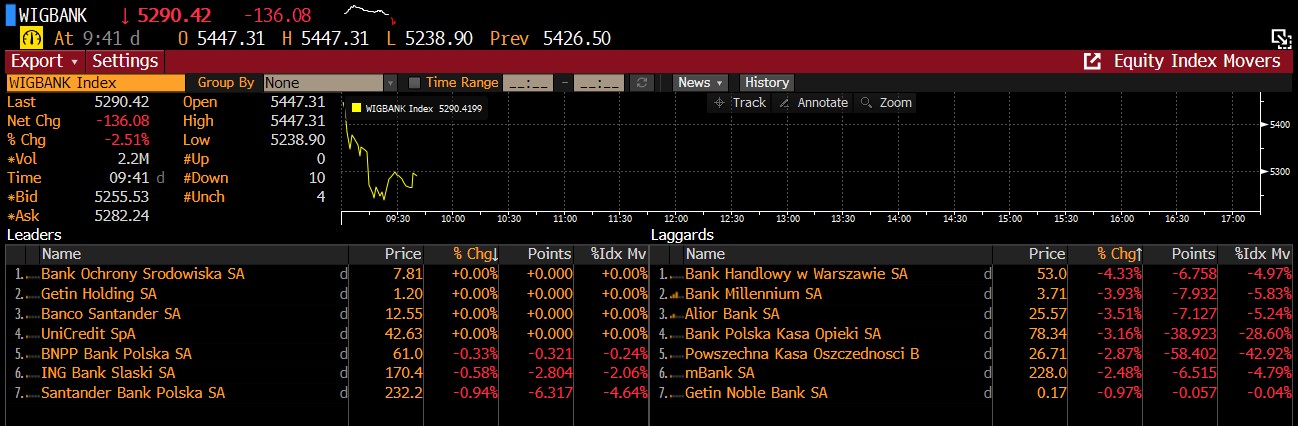 Pierwsza w tym tygodniu sesja giełdowa na polskim parkiecie przynosi słabe nastroje wśród przedstawicieli sektora bankowego. Walory tracą na wartości ze względu na obawy inwestorów o nałożenie na instytucje podatku od zysków. Przedstawiciele polskiego establishmentu zaważyli na obecnych nastrojach inwestorów, komentując plany wobec sektora. W tę sobotę, prezes partii PiS, Pan Jarosław Kaczyński skomentował, że banki muszą pójść po rozum do głowy i podnieść oprocentowanie depozytów. W przeciwnym razie należy będzie ich zyski obłożyć podatkiem - dodał Kaczyński. Co więcej, premier Mateusz Morawiecki ma już prowadzić rozmowy w tej sprawie. Artur Soboń, obecny wiceminister finansów skomentował dzisiaj w Polskim Radiu 24, że być może należytym będzie nałożeniu podatku od nadmiernych zysków banków.
