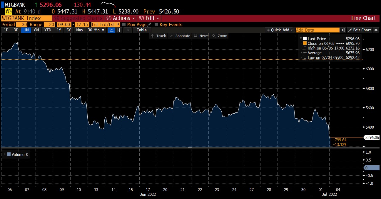 Zmiany procentowe przedstawicieli największych banków notowanych na GPW. 04.07.22. Źródło: Bloomberg