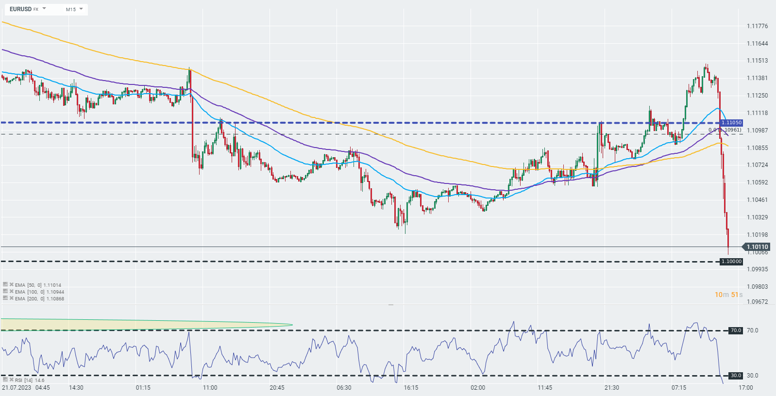 Para EURUSD przedłuża spadki do 0,6% zapoczątkowane po publikacji bardzo dobrych danych makro z USA. Źródło: xStation 5
