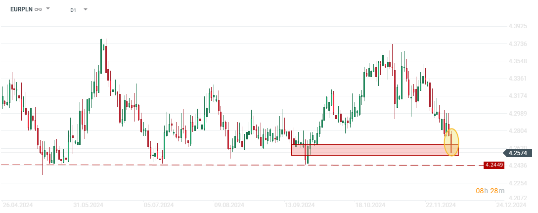 Wobec wypowiedzi prezesa NBP złoty umacnia się na rynku walutowym. Para EURPLN spada do najniższego poziomu od września, zbliżając się do tegorocznych minimów. Źródło: xStation