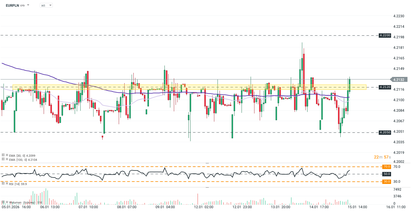EURPLN zyskało marginalne 0,05% od początku konferencji prof. Glapińskiego. Kurs delikatnie wychylił się powyżej górnego ograniczenia aktualnej konsolidacji (4,2120). Źródło: xStation5