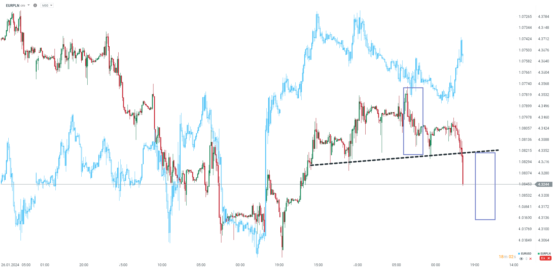 EURPLN wyraźnie spada po słowach wskazujących na chęć dłuższego utrzymania stóp procentowych bez zmian w najbliższym czasie.