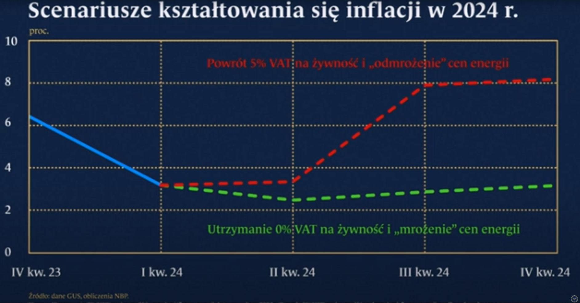 Patrząc na "najgorszy" scenariusz inflacyjny wg NBP, wtedy obniżki byłby mało prawdopodobne. Źródło: NBP