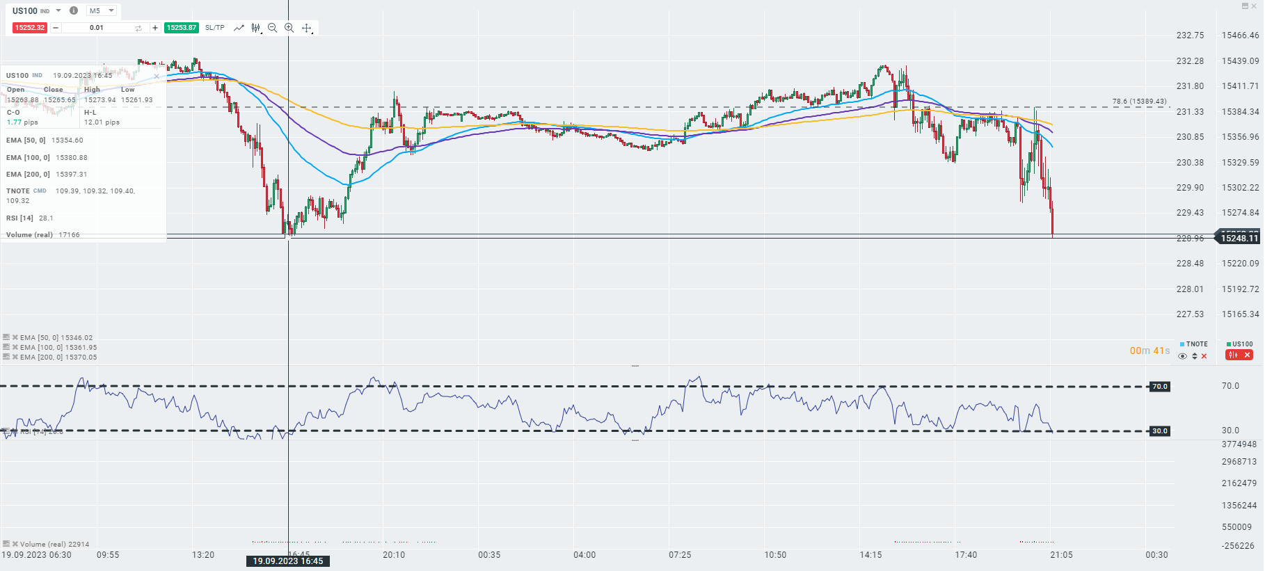 W drugiej części przemówienie Powella spadki na indeksie US100 przyspieszyły i obecnie testowane są poziomy wczorajszych minimów. Źródło: xStation 5