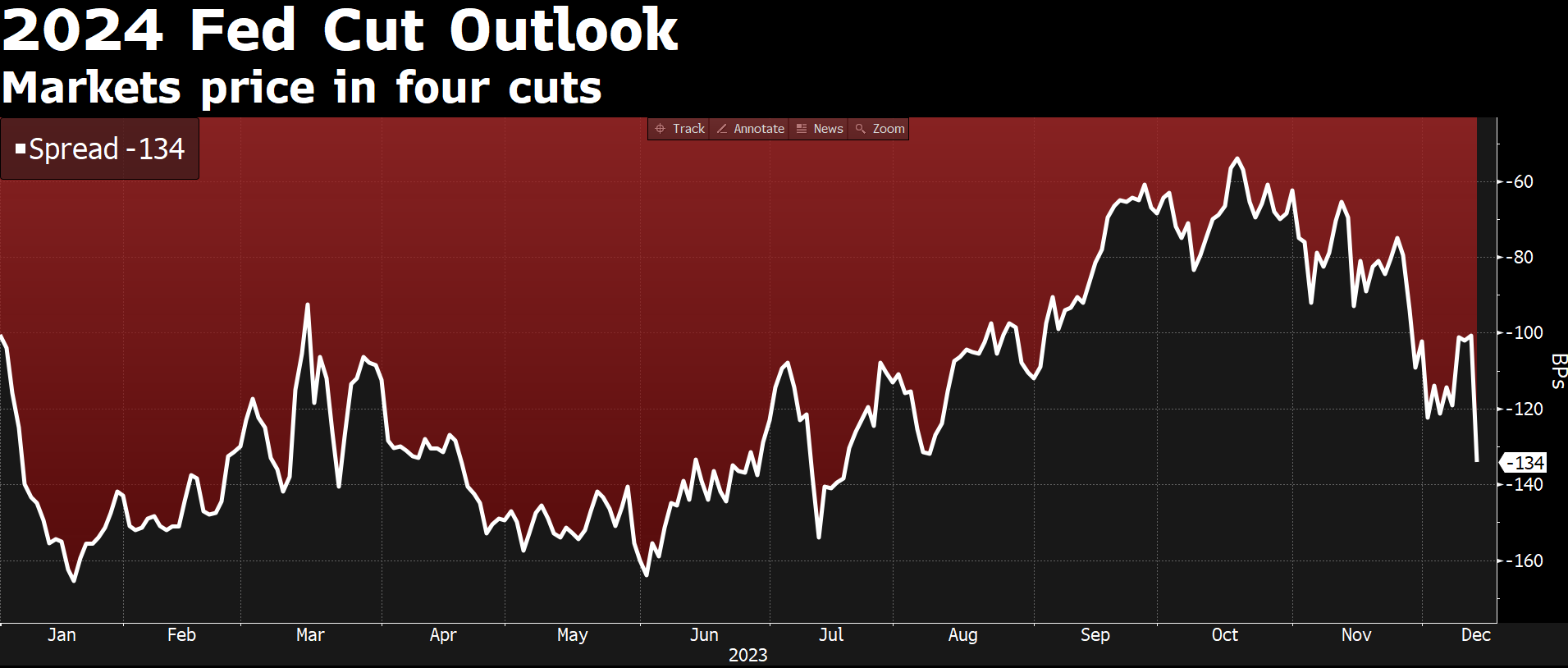 - Aktualizacja z godziny 21:05; Rynek swapów wycenia, że w 2024 stopy procentowe zostaną obniżone o łącznie 134 punktów bazowych
