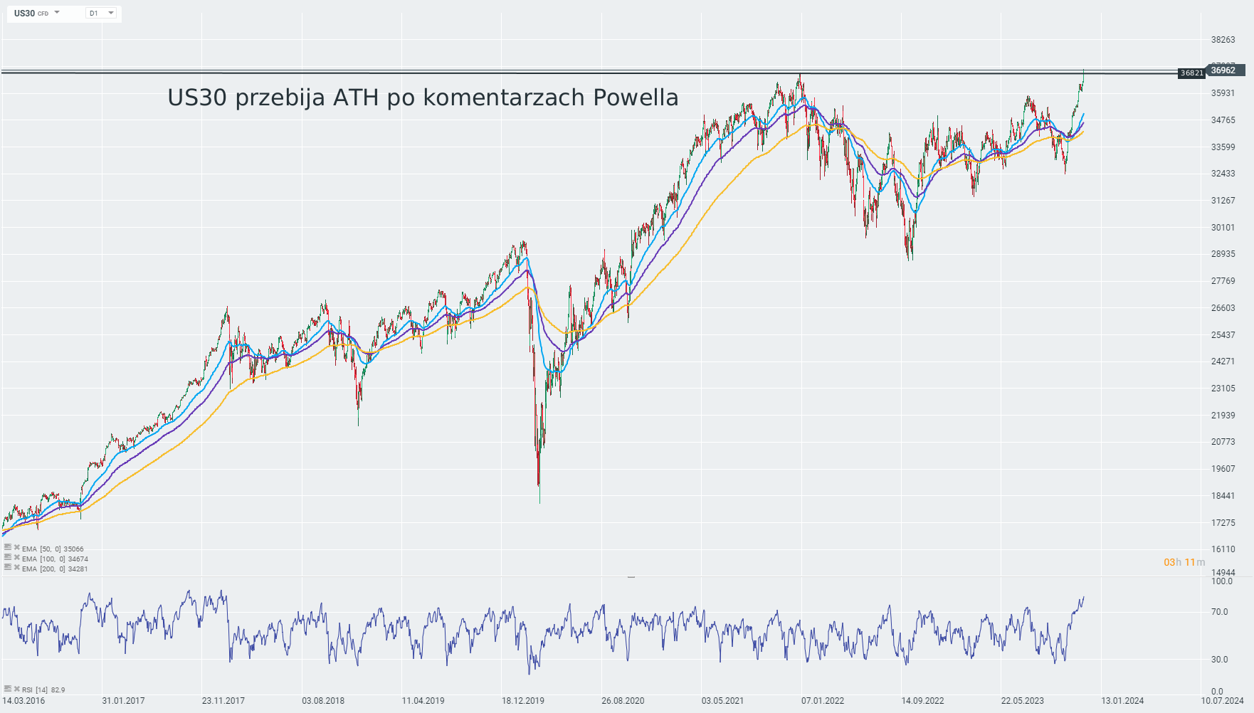 Komentarze Powella wydają się przybierać wyraźnie gołębi ton. Wzmianka o poruszeniu tematu pierwszej obniżki stóp wzmocnił byczy zryw widoczny na rynkach, który w ujęciu ogólnym doprowadził indeks US30 powyżej historycznych maksimów. FED tłumaczy, że stopy procentowe znajdują się już na poziomie docelowym lub są bardzo blisko tej wartości. Powell dodaje jednak, że jeśli sytuacja będzie tego wymagała, FED zdecyduje się na kolejną podwyżkę stóp.