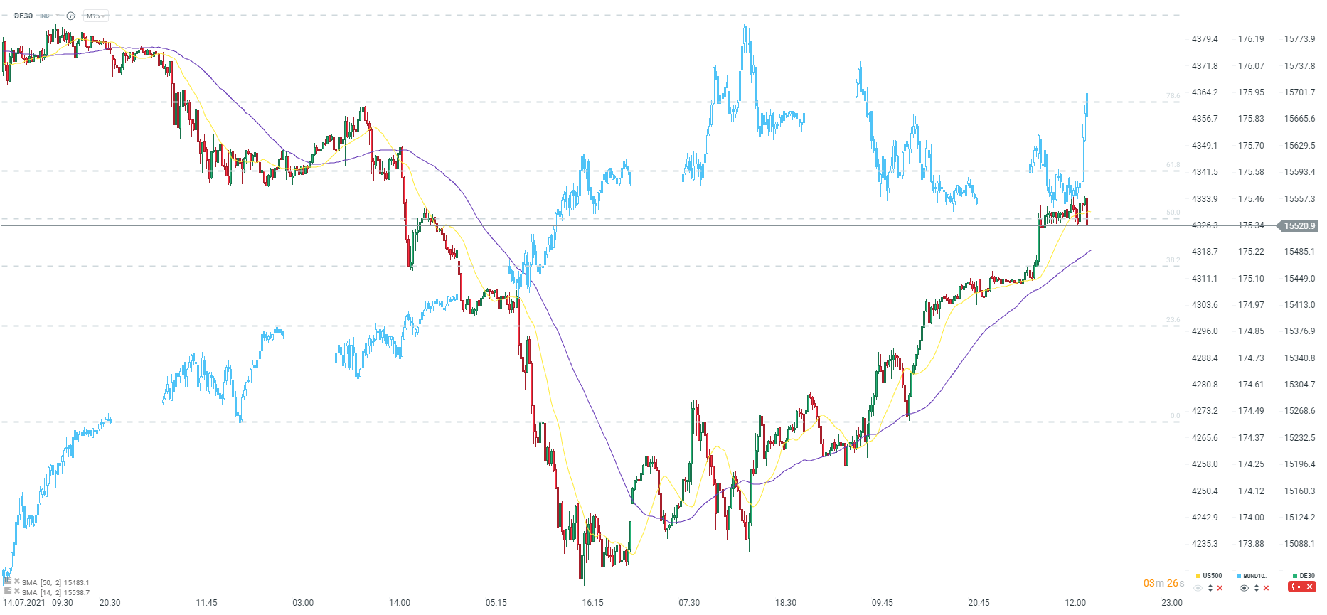 DE30 nieco spada w odpowiedzi na spadek rentowności (wzrost Bundów). Źródło: xStation5