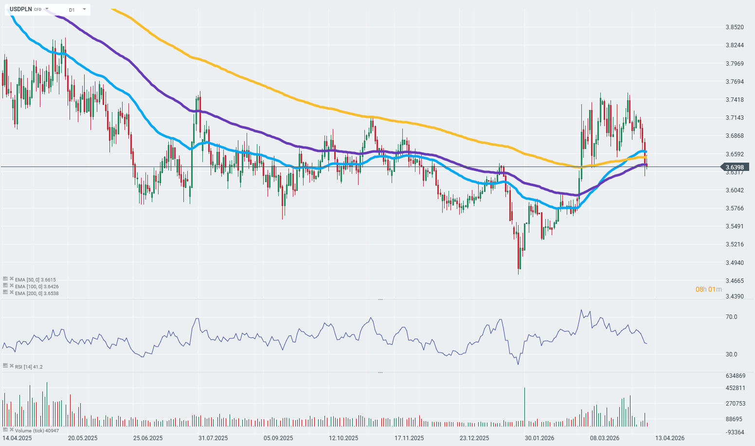 Rynek wyraźnie wycenia scenariusz łagodzenia konfliktu. Świadczy o tym przedłużająca się fala spadków USDPLN poniżej 200-dniowej EMA, która z perspektywy analizy technicznej stanowi istotny punkt kontrolny trwającego trendu na parze. Warto pamiętać, że przed atakami na Iran PLN radził sobie na rynku dużo lepiej niż USD. Źródło: xStation
