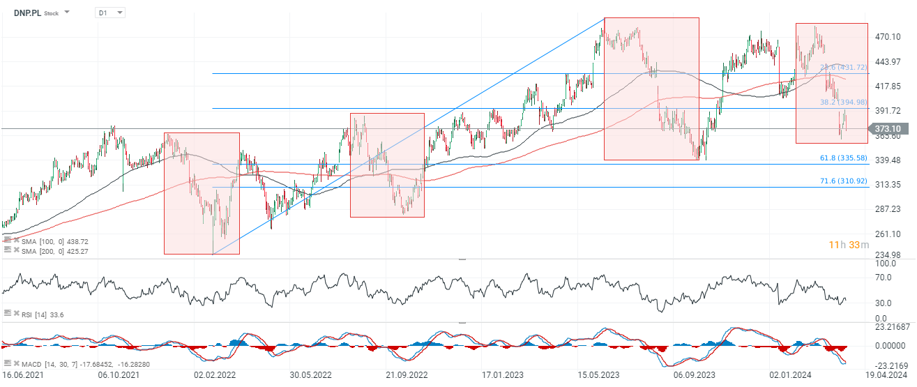 Akcje Dino Polska (DNP.PL) tracą dziś prawie 4% i oczywiście tłem tych spadków są obawy wokół wpływu 'dezinflacji' na spadek marż (widoczny w IV kw. 2023) i spowolnienie tempa wzrostu przychodów. Dochodzą do tego obawy o konkurencyjną presję ze strony największych sieci jak Biedronka (Jeronimo Martins), Lidl czy Kaufland, które zadeklarowały już, że nie podniosą cen towarów mimo wzrostu VAT do 5%, od 1 kwietnia. Akcje Dino są w 2024 najsłabszym komponentem indeksu WIG20, ale krajobraz techniczny może sugerować pozytywny rezultat, dopóki walory utrzymują istotne wsparcie w okolicach 340 PLN za walor. Spadek poniżej niego zanegowałby scenariusz korekty 1:1 i mógł sugerować dłuższy okres słabości walorów.