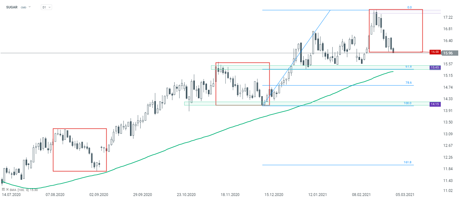 W ostatnich dniach możemy obserwować wyraźne cofnięcie na rynku cukru. Korektę można tłumaczyć rozwiązaniem problemów z załadunkami w Brazylii, a także z brakiem kontenerów w Indiach. Patrząc na wykres technicznie, notowania dotrwały jednak do kluczowego poziomu technicznego. Poziom 16,00 wynika z dolnego ograniczenia układu 1:1, a warto zauważyć, że w przeszłości już dwukrotnie mieliśmy do czynienia z podobnego rozmiaru korektą. Jeżeli kupujący zdołają obronić wsparcie, niewykluczona jest kolejna fala wzrostowa. W przeciwnym razie, w przypadku zanegowania - kolejną wartą uwagi podporą dla rynkowych byków powinna być strefa przy 15,45.