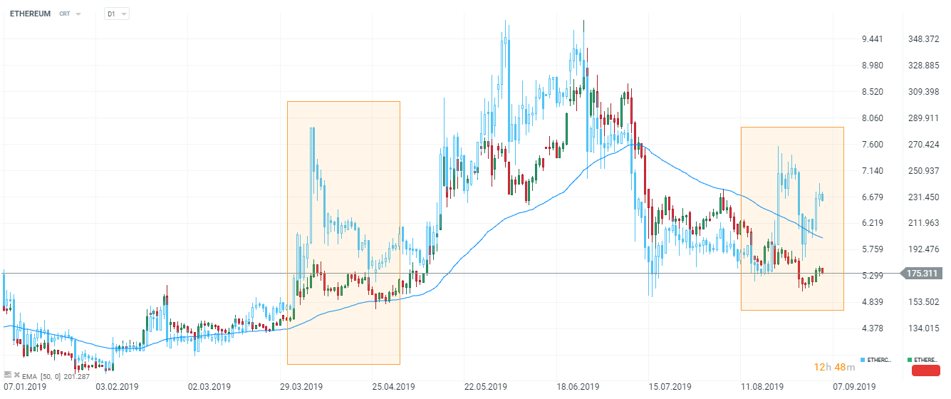 Gdy zestawimy wykres Ethereum z Ethereum Classic, obserwujemy sporą korelację tych dwóch kryptowalut, jednakże w ostatnich dniach widzimy spory rozstrzał między cenami powyższych aktywów. Patrząc historycznie na wykres możemy zauważyć, że poprzednie wybicie ETC dało początek dużemu wzrostowi tych dwóch walut. Stąd też i aktualny rozstrzał można traktować jako sygnał zwiastujący przyszłą zmianę ceny.