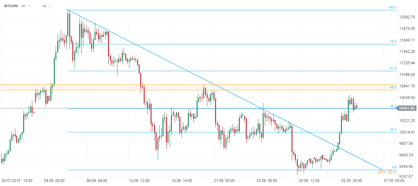 Istnieje spora szansa, że w najbliższych dniach strona popytowa będzie ponownie testować strefę oporu w okolicach 50% zniesienia Fibo. Jeśli jednak powyższy scenariusz nie znajdzie realizacji, następnym poziomem, na którym Bitcoin może szukać silnego wsparcia, jest poziom 9300 - okolica lipcowych minimów. Źródło: xStation5
