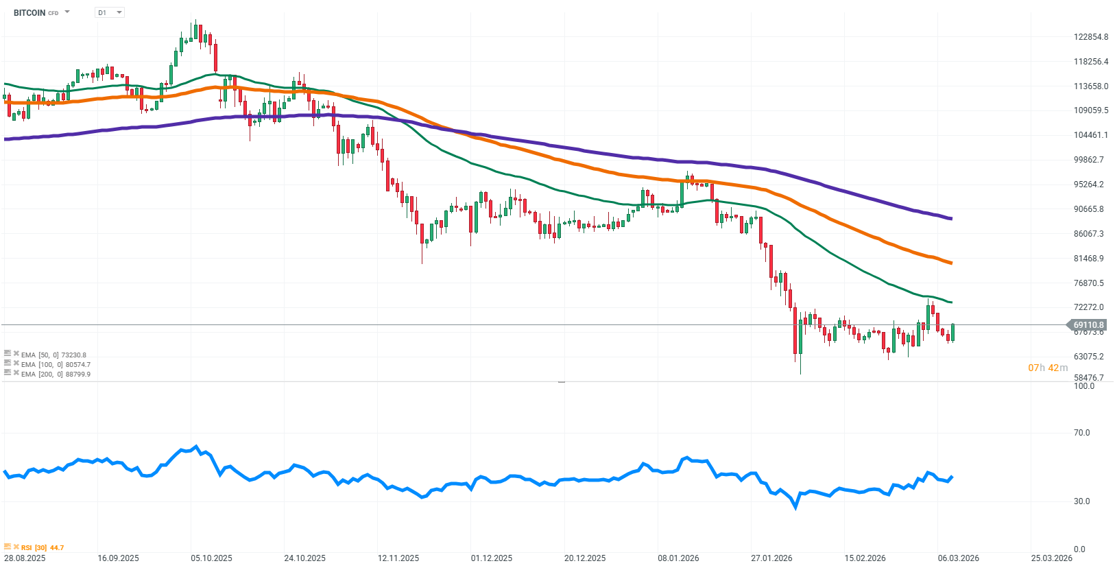 Mimo eskalacji konfliktu na Bliskim Wschodzie oraz wzrostu cen ropy naftowej powyżej 100 USD za baryłkę, rynek kryptowalut odnotowuje dziś wyraźne wzrosty, przekraczające 4 %. Bitcoin utrzymuje się powyżej 69 000 USD, a Ethereum przekracza 2 000 USD. W tym samym czasie tradycyjne giełdy wykazują spadki, co pokazuje różnice w reakcjach między rynkami finansowymi a rynkami cyfrowych aktywów.