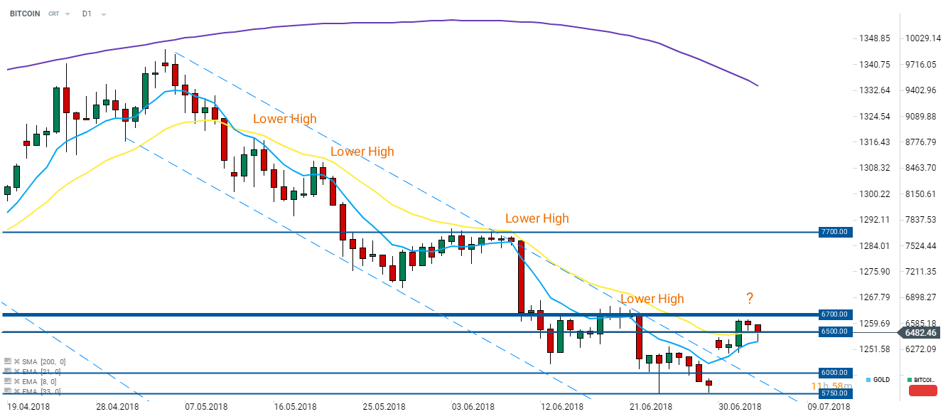Po silnych wzrostach na głównych kryptowalutach na początku tego tygodnia, obserwujemy uspokojenie atmosfery. Najpopularniejsza kryptowaluta jest handlowana niewiele poniżej wczorajszego zamknięcia. Kupujący próbują obronić poziom 6500 $, podczas gdy Ethereum ponownie odbija od poziomu wsparcia.