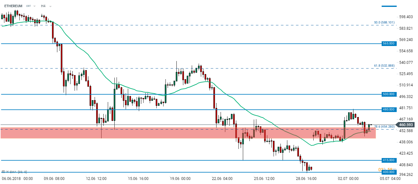 Po nieudanym spadku poniżej 480$, Ethereum powraca powyżej strefy wsparcia (czerwona strefa). Wspomniana strefa pokrywa się ze zniesieniem 78,6% poprzedniego ruchu wzrostowego i 33 - okresową średnią kroczącą. Z technicznego punktu widzenia retest poziom 480 $ może pozostać kwestią czasu. Źródło: xStation5
