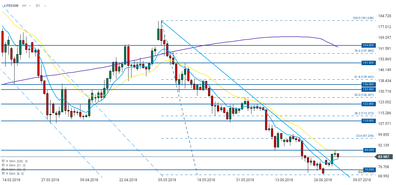 Po wyłamaniu powyżej linii trendu spadkowego kurs Litecoina znajduje się pomiędzy średnią 8 i 21-okresową. Warto zauważyć, że tworzący się dolny cień dzisiejszej świeczki świadczy o obecności kupujących w okolicach 8-okresowej średniej kroczącej. Źródło: xStation5.