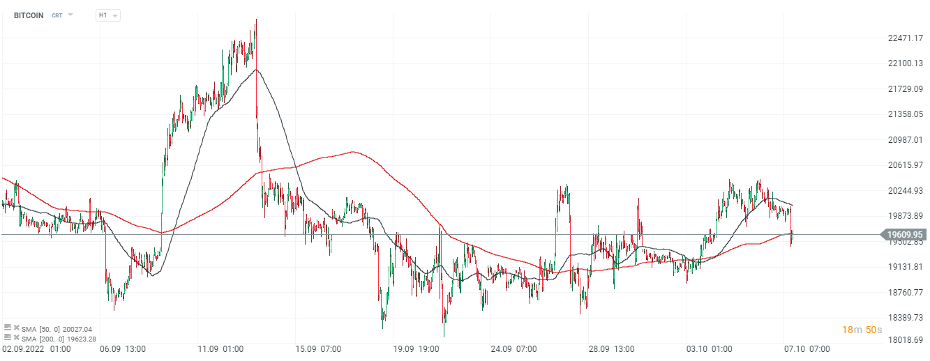 Bitcoin, interwał H1. Notowania głównej kryptowaluty osunęły się poniżej 19 6000 USD i walczą o utrzymanie się powyżej SMA 200. Zakończenie dzisiejszej sesji powyżej 20 000 USD mogłoby zwiastować 'udany weekend' dla cyfrowych aktywów jednak potencjał do ruchu w dół wydaje się wciąż równie prawdopodobny. Widać, że rynek podobnie interpretuje obecne zdarzenia - stąd mamy doczynienia z konsolidacją w której żadna ze stron nie jest przekonana do większego ruchu w którąś ze stron. Historycznie jednak takie momenty nie trwały zbyt długo, zatem ekstrapolując możemy spodziewać się nadchodzącej, skokowej zmienności na rynku Bitcoina. Z uwagi na fakt, że Bitcoin niejednokrotnie zaskakiwał inwestorów i wymykał się prognozom, ponowna wspinaczka powyżej 20 000 USD nie powinna zaskoczyć rynków. Źródło: xStation5
