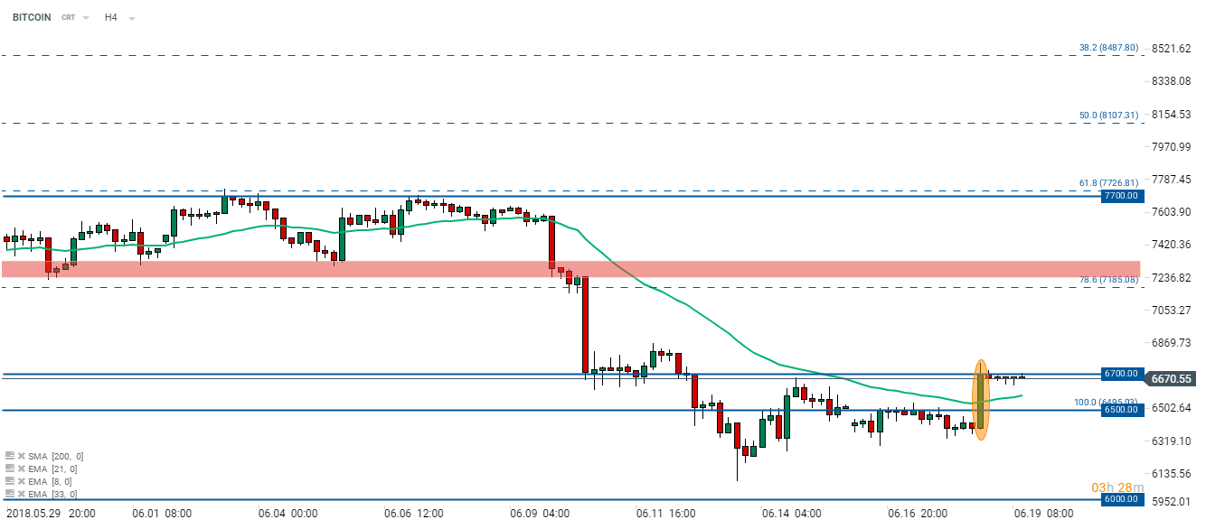 Cena Bitcoina wyskoczyła do góry po wiadomościach, że Square otrzymał licencję na handel kryptowalutami. Cena osiągnęła poziom 6700$, lecz nie udało jej się pokonać tego poziomu. W ostatnich godzinach widzimy na rynku marazm, gdzie żadna ze stron nie może uzyskać przewagi. Po stronie byków mamy rosnącą średnią 33-okresową. Źródło: xStation5