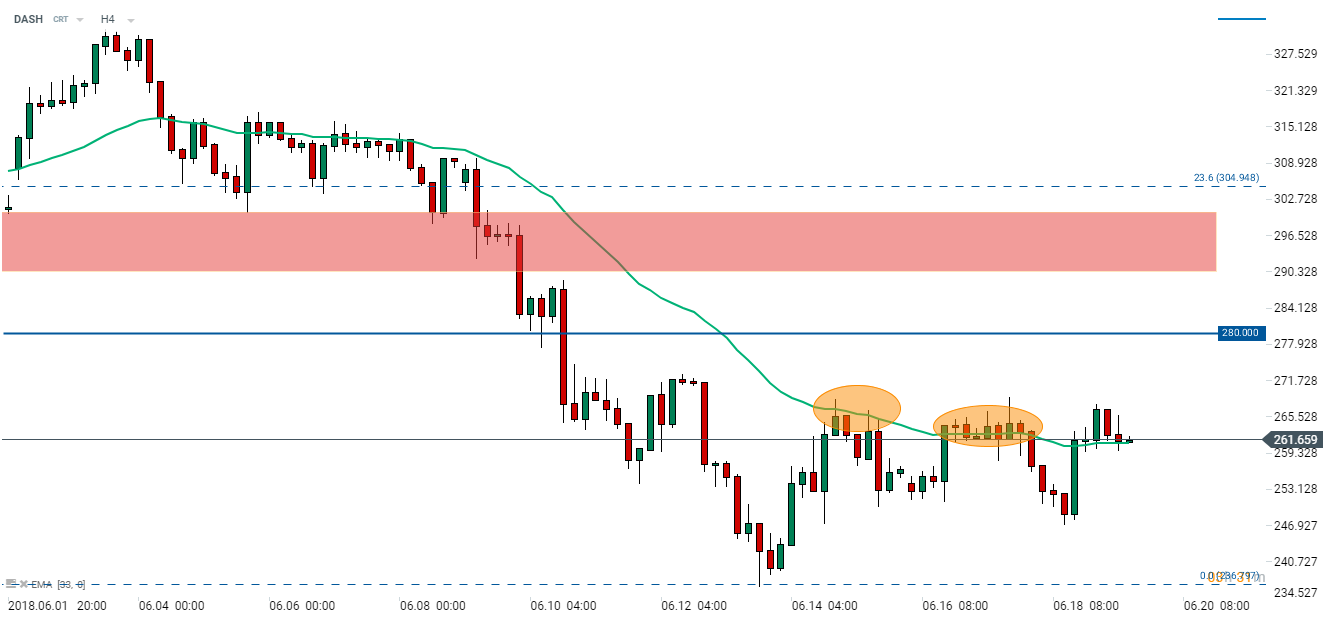 Dash zachowuje się gorzej od pozostałych głównych kryptowalut. Warto zauważyć, że w ostatnich godzinach po spadku poniżej średniej 33-okresowej na wykresie 4-godzinnym, notowaniom udało się powrócić powyżej. Może to dobrze wróżyć stronie popytowej w ujęciu technicznym. Źródło: xStation5