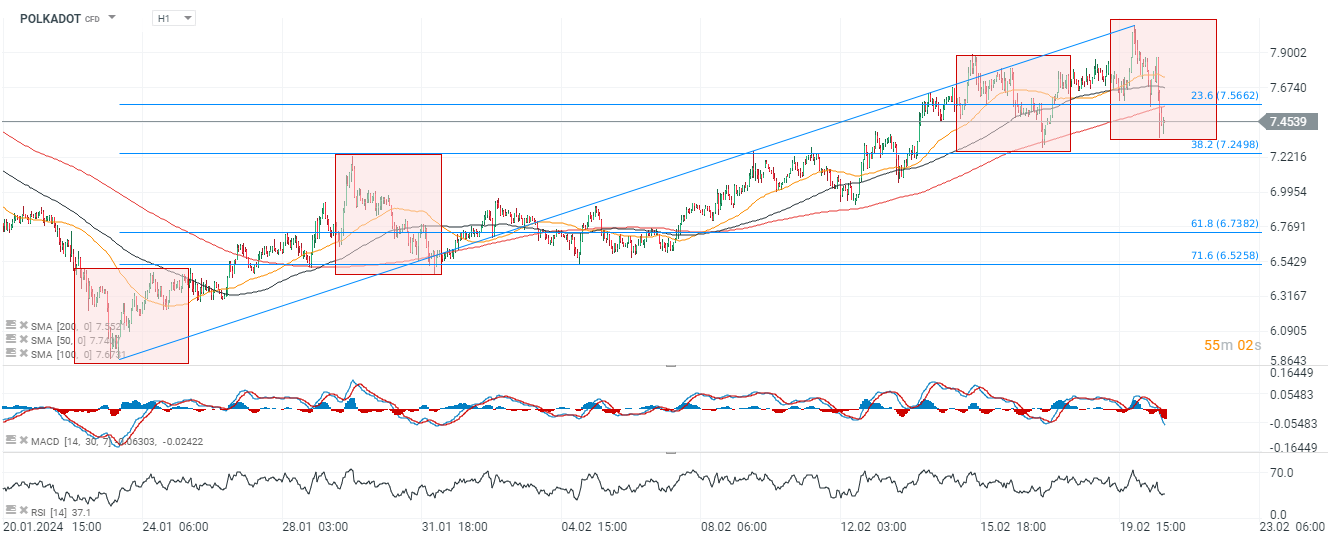 Cena jednego z największych projektów crypto, Polkadot tąpnęła poniżej średnich SMA200,100 i 50 oraz 23,6 zniesienia Fibonacciego fali wzrostowej z końcówki stycznia. Kluczowym wsparciem okazać może się 38,2 zniesienie Fibo przy 7,24 USD, a spadek poniżej niego może sugerować re-test poziomów poniżej 7 USD.