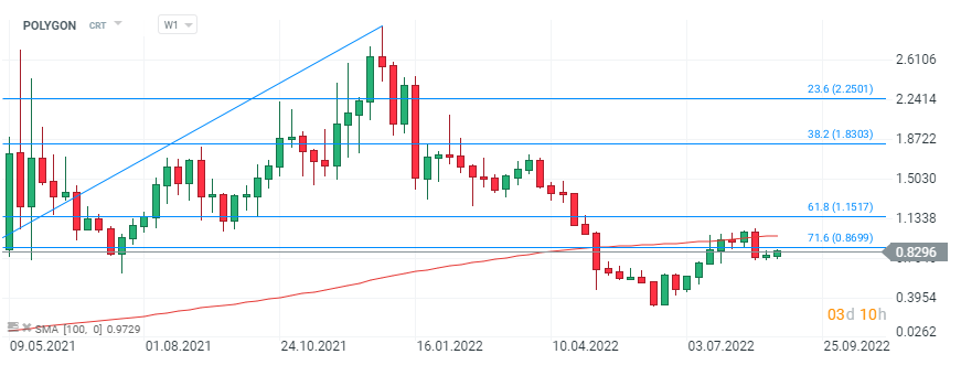 Wykres Polygon, interwał W1. Kryptowaluta, które silnie skorelowana jest z blockchainem Ethereum znajduje się w silnym trendzie spadkowym od początku roku, lecz wciąż radzi sobie lepiej od Cardano. Wsparcie w postaci 71.6 zniesienia Fibonacciego zostało naruszone wraz ze 100 dniową średnią kroczącą w obliczu słabnącego sentymentu wokół cyfrowych aktywów. Polygon wciąż ma szansę skorzystać na Ethereum merge, jeśli transforamcja Ethereum zakończy się sukcesem. Źródlo: xStation5