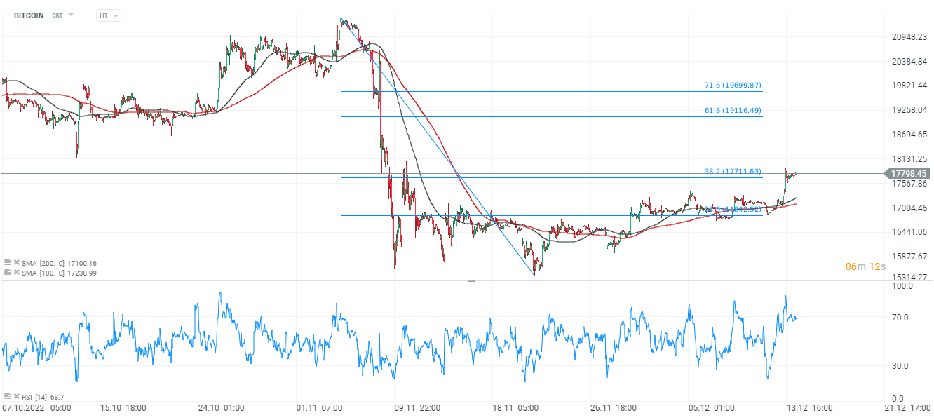 Wykres Bitcoina, interwał H1. Wskaźnik siły względnej głównej kryptowaluty znajduje się w okolicach 70 punktów, co potwierdza poziomy bliskie wykupieniu. Cena znalazła się powyżej 38.2 zniesienia Fibonacciego. Wydaje się możliwe, że gołębio przemawiający Powell spowoduje wzrost ceny w okolice 19 000 USD. Z kolei wciąż jastrzębia narracja wokół polityki monetarnej w przyszłym roku może spowodować wzrost awersji do ryzyka i retest poziomów 17 000 USD, skąd niedźwiedzie będą chciały przetestować trwałość ostatniego odreagowania. Źródło: xStation5
