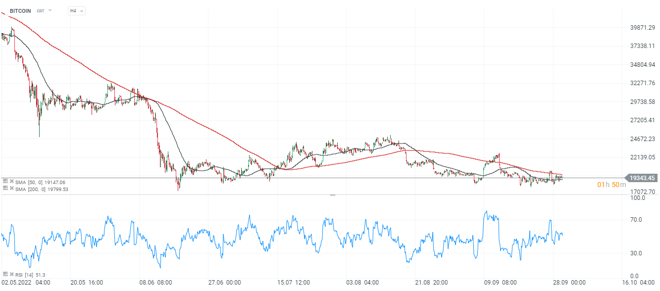 Bitcoin, interwał H4. Król kryptowalut porusza się w trendzie bocznym jednak historia kryptowalut pokazuje, że trendy takie nie trwają zbyt długo i są przecinane skokami zmienności. Bitcoin nie zdołał wejść powyżej 20 000 USD i wciąż notowany jest w wąskim zakresie między SMA 200 a SMA 50. Ponownie niepokojący odczyt wskaźnika PCE w USA i awersja do ryzyka przed weekendem może osłabić notowania kryptowalut. Źródło: xStation5