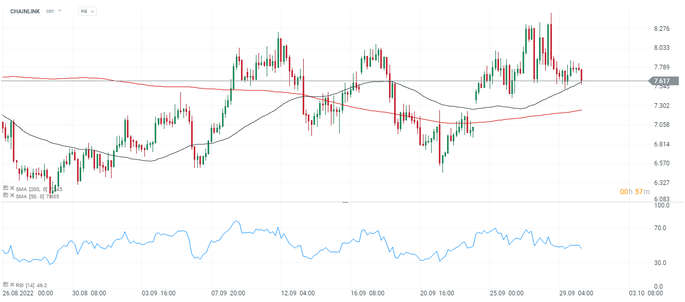 Chainlink, interwał D1. Kryptowaluta pozytywnie zareagowała na informacje o partnerstwie ze SWIFT jednak opór powyżej 8 USD wciąż trzyma się mocno. Pozytywnym wydaje się fakt, że cena Chainlinku utrzymuje sie powyżej 50 oraz 200 dniowej średniej kroczącej na interwale 4 godzinnym. Obie średnie przecięły się tworząc formację tzw. 'złotego krzyża', który może dać Chainlinkowi sporo paliwa do dalszego wzrostu. Dla kryptowaluty kluczowa pozostanie wciąż kondycja Bitcoina. Źródło: xStation5