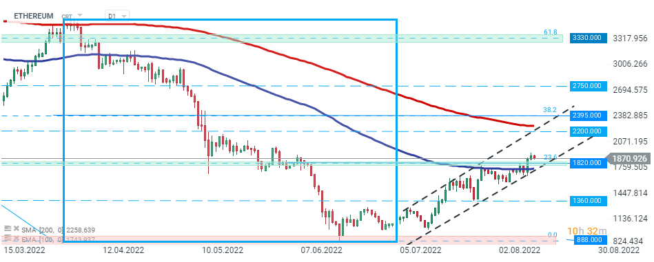 Wykres Ethereum, interwał D1. Z technicznego punktu widzenia, Ethereum niedawno odbiło się od dolnego limitu kanału wzrostowego i przebiło główny opór na poziomie 1820 USD, który jest zaznaczony wcześniejszymi reakcjami cenowymi i 23,6% zniesieniem Fibonacciego ostatniej fali spadkowej. Dopóki cena znajduje się powyżej wspomnianego poziomu, możliwa jest kontynuacja ruchu wzrostowego. Źródło: xStation5