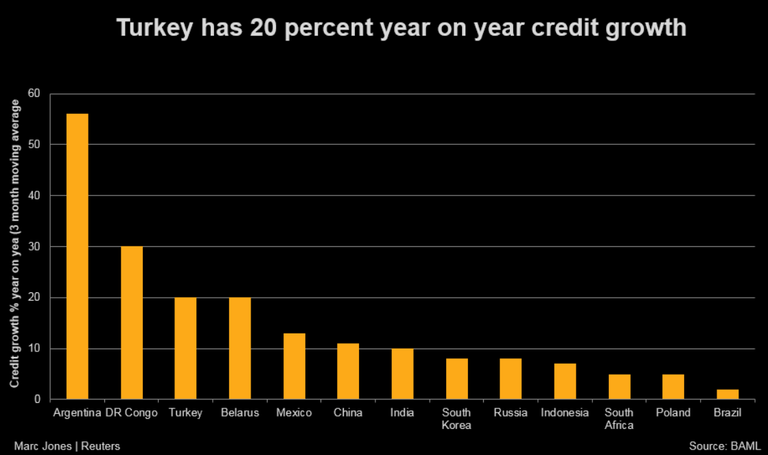 Turcja korzystała nie tylko z zagranicznego, ale również z krajowego kredytowania w celu napędzania gospodarki. Wzrost podaży kredytów na poziomie 20% zdecydowanie nie jest oznaką stabilności, a patrząc jakie państwa znajdują się obok Turcji na powyższym wykresie (Argentyna, Kongo, Białoruś) jest to powód do obaw. W przypadku problemów tureckich przedsiębiorstw sektor bankowy może być mocno zagrożony.