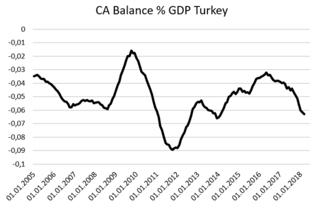 Kiedy na rynku jest dużo pieniędzy - głównie za sprawą finansowania krajowego i zagranicznego - rośnie również popyt. Kiedy popyt przekracza możliwości produkcyjne mamy do czynienia z dwoma rzeczami: deficytem handlowym i inflacją. Turcja ma do czynienia z oboma. W normalnych warunkach bank centralny podniósłbym stopy procentowe w celu zbilansowania popytu podażą. CBRT miał jednak związane ręce przez politykę “wzrostu za wszelką cenę” prezydenta Erdogana. Wysoki deficyt na rachunku bieżącym zwiększa zależność od finansowania zagranicznego, a kiedy nie ma kapitału, który można by pożyczyć waluta może się mocno osłabić, ponieważ konieczny będzie zakup walut zagranicznych na rynku.