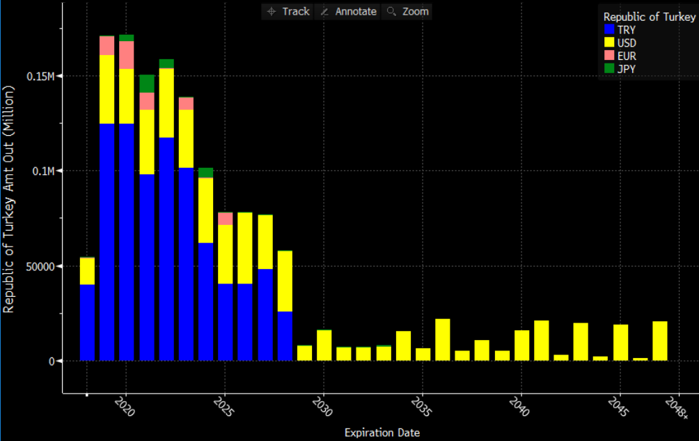 Erdogan powiedział Turkom, że nie muszą się przejmować kursami walutowymi. Problemem jest to, że tureckie spółki jeszcze przez wiele lat będą potrzebowały dolarów, żeby spłacić zobowiązania. Źródło: Bloomberg