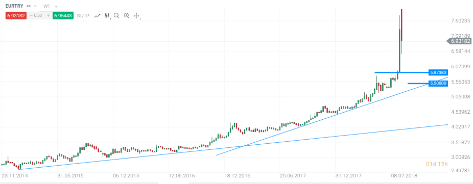 Cofnięcie się EURTRY do którejś z linii trendu byłoby wymarzonym scenariuszem dla władz Turcji. Źródło xStation5