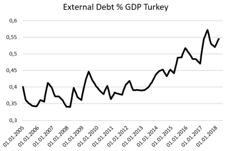 Wzrost za wszelką cenę - taka była polityka prezydenta Erdogana, która pozwoliła Turcji osiągnąć oszałamiające tempo wzrostu - 11,3% - w trzecim kwartale 2017 roku. Niemniej jednak, taka sytuacja mocno nadwyrężyła fundamenty gospodarki tureckiej. W świecie niskich stóp procentowych tureckie firmy chętnie pożyczały kapitał w dolarach amerykańskich doprowadzając zadłużenie całej gospodarki do ponad 460 miliardów USD lub około 53% PKB. W rezultacie Turcja potrzebuje dolarów do spłaty zobowiązań albo chociaż rolowania długu.