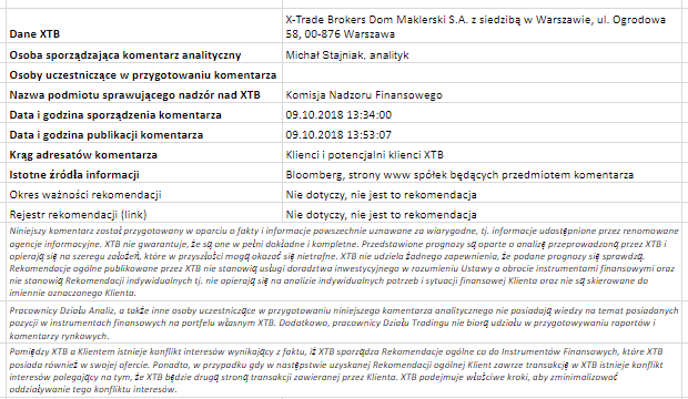 Ta publikacja handlowa jest informacyjna i edukacyjna. Nie jest rekomendacją inwestycyjną ani informacją rekomendującą lub sugerującą strategię inwestycyjną. W materiale nie sugerujemy żadnej strategii inwestycyjnej ani nie świadczymy usługi doradztwa inwestycyjnego. Materiał nie uwzględnia indywidualnej sytuacji finansowej, potrzeb i celów inwestycyjnych klienta. Nie jest też ofertą sprzedaży ani subskrypcji. Nie jest zaproszeniem do nabycia, reklamą ani promocją jakichkolwiek instrumentów finansowych. Publikację handlową przygotowaliśmy starannie i obiektywnie. Przedstawiamy stan faktyczny znany autorom w chwili tworzenia dokumentu. Nie umieszczamy w nim żadnych elementów oceniających. Informacje i badania oparte na historycznych danych lub wynikach oraz prognozy nie stanowią pewnego wskaźnika na przyszłość. Nie odpowiadamy za Twoje działania lub zaniechania, zwłaszcza za to, że zdecydujesz się nabyć lub zbyć instrumenty finansowe na podstawie informacji z tej publikacji handlowej. Nie odpowiadamy też za szkody, które mogą wynikać z bezpośredniego czy też pośredniego wykorzystania tych informacji. Inwestowanie jest ryzykowne. Inwestuj odpowiedzialnie.
