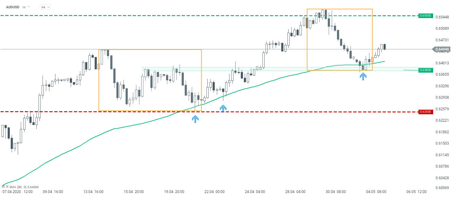 Para walutowa AUDUSD kontynuuje wzrosty po odbiciu od wsparcia przy 0,6380. Jeśli tendencja zostanie utrzymana, niewykluczony jest ruch w kierunku ostatnich szczytów przy 0,6550. Źródło: xStation5