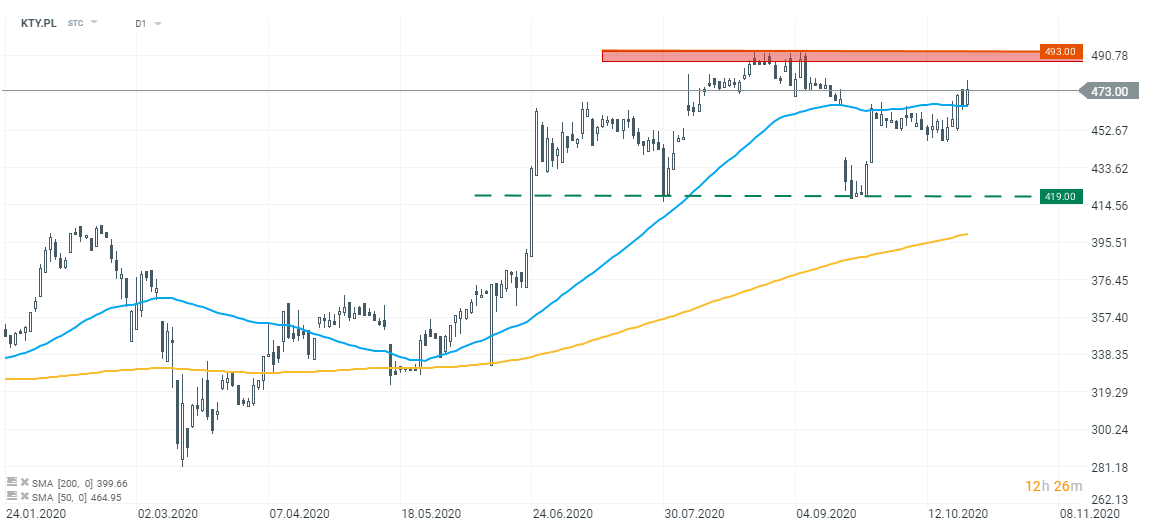 Kurs spółki znalazł się dziś powyżej 50-sesyjnej średniej kroczącej (niebieska linia). Tym samym notowania zbliżają się do historycznych szczytów z przełomu sierpnia i września w okolicach 493 zł. Źródło: xStation5