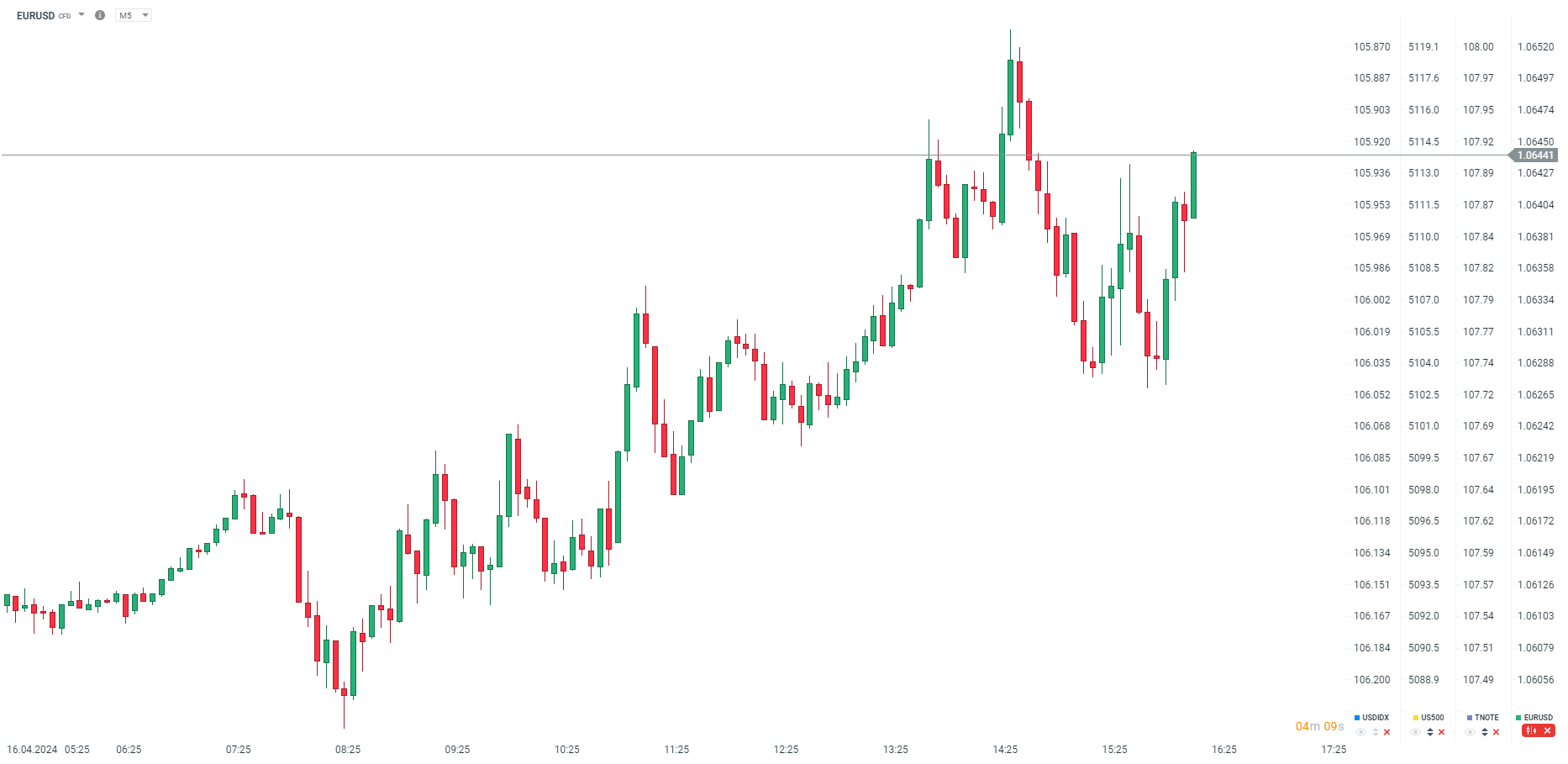 EURUSD przed moment spadł w okolice poziomu 1,0630, ale ponownie odbija w kierunku dziennych szczytów w okolicach poziomu 1,0650.