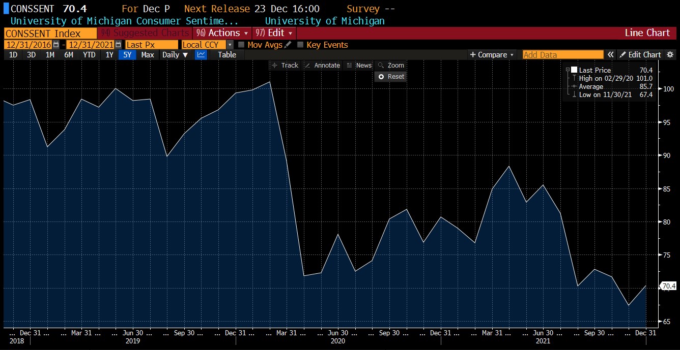 Wstępne wskazanie indeksu Uniwersytetu Michigan, które poznaliśmy o 16:00 pokazało poprawę ogólnych nastrojów konsumenckich. Indeks wzrósł z 67,4 do 70,4 w grudniu (wobec 67,1 zakładanych przez analityków).Wskaźnik oczekiwań konsumentów również wzrósł do 67,8, podczas gdy rynki oczekiwały spadku indeksu do 62. Tuż po publikacji indeksy giełdowe zareagowały lekkim wzrostem.