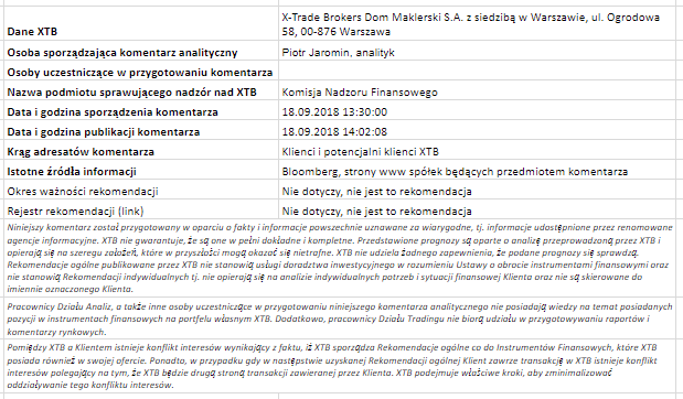 Ta publikacja handlowa jest informacyjna i edukacyjna. Nie jest rekomendacją inwestycyjną ani informacją rekomendującą lub sugerującą strategię inwestycyjną. W materiale nie sugerujemy żadnej strategii inwestycyjnej ani nie świadczymy usługi doradztwa inwestycyjnego. Materiał nie uwzględnia indywidualnej sytuacji finansowej, potrzeb i celów inwestycyjnych klienta. Nie jest też ofertą sprzedaży ani subskrypcji. Nie jest zaproszeniem do nabycia, reklamą ani promocją jakichkolwiek instrumentów finansowych. Publikację handlową przygotowaliśmy starannie i obiektywnie. Przedstawiamy stan faktyczny znany autorom w chwili tworzenia dokumentu. Nie umieszczamy w nim żadnych elementów oceniających. Informacje i badania oparte na historycznych danych lub wynikach oraz prognozy nie stanowią pewnego wskaźnika na przyszłość. Nie odpowiadamy za Twoje działania lub zaniechania, zwłaszcza za to, że zdecydujesz się nabyć lub zbyć instrumenty finansowe na podstawie informacji z tej publikacji handlowej. Nie odpowiadamy też za szkody, które mogą wynikać z bezpośredniego czy też pośredniego wykorzystania tych informacji. Inwestowanie jest ryzykowne. Inwestuj odpowiedzialnie.