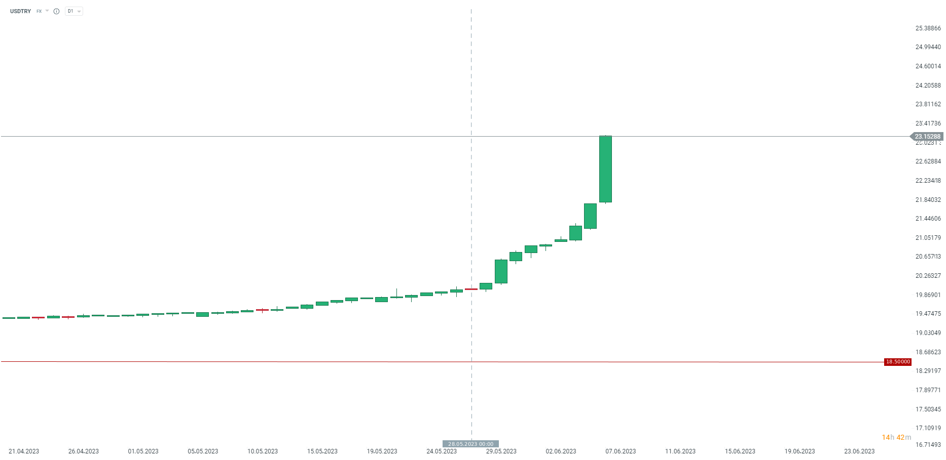 Dzisiaj lira traci ponad 6%, a od drugiej tury lira straciła ponad15%. Źródło: xStation5