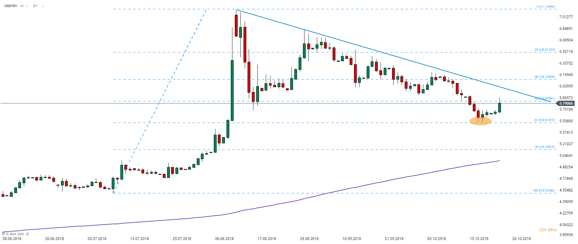Kurs USDTRY cofnął się do zniesienia 61,8% impulsu wzrostowego rozpoczętego w lipcu tego roku. Pomimo dwukrotnego ataku na ten poziom (pomarańczowe kółko na wykresie) kupujący musieli skapitulować. Doniesienia o rozłamie w koalicji MHP-AKP przed wyborami samorządowymi sprawiły, że kurs rósł momentami nawet powyżej 5,87. Jednak od tamtego czasu kurs zdążył się cofnąć poniżej zniesienia 50% przy 5,82. Źródło: xStation5