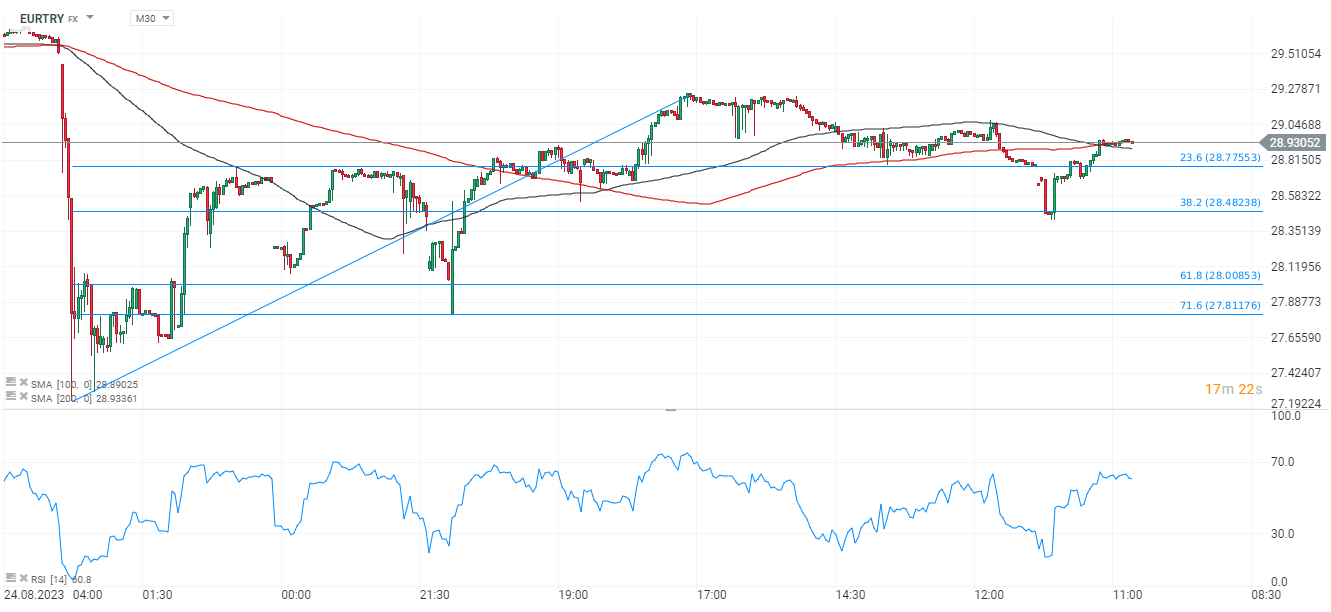 Dzisiejsze dane z Turcji okazały się wyższe od prognoz i pokazały, że mimo radykalnych ruchó ze strony CBRT inflacja wciąż jest problemem co stawia spory znak zapytania nad przyszłością tureckiej gospodarki. Lira szybko rozoczęła ruch wzrostowy, a celem spekulantów jest wejście powyżej poziomu 29,5 na EURTR oaz 30 na USDTRY.