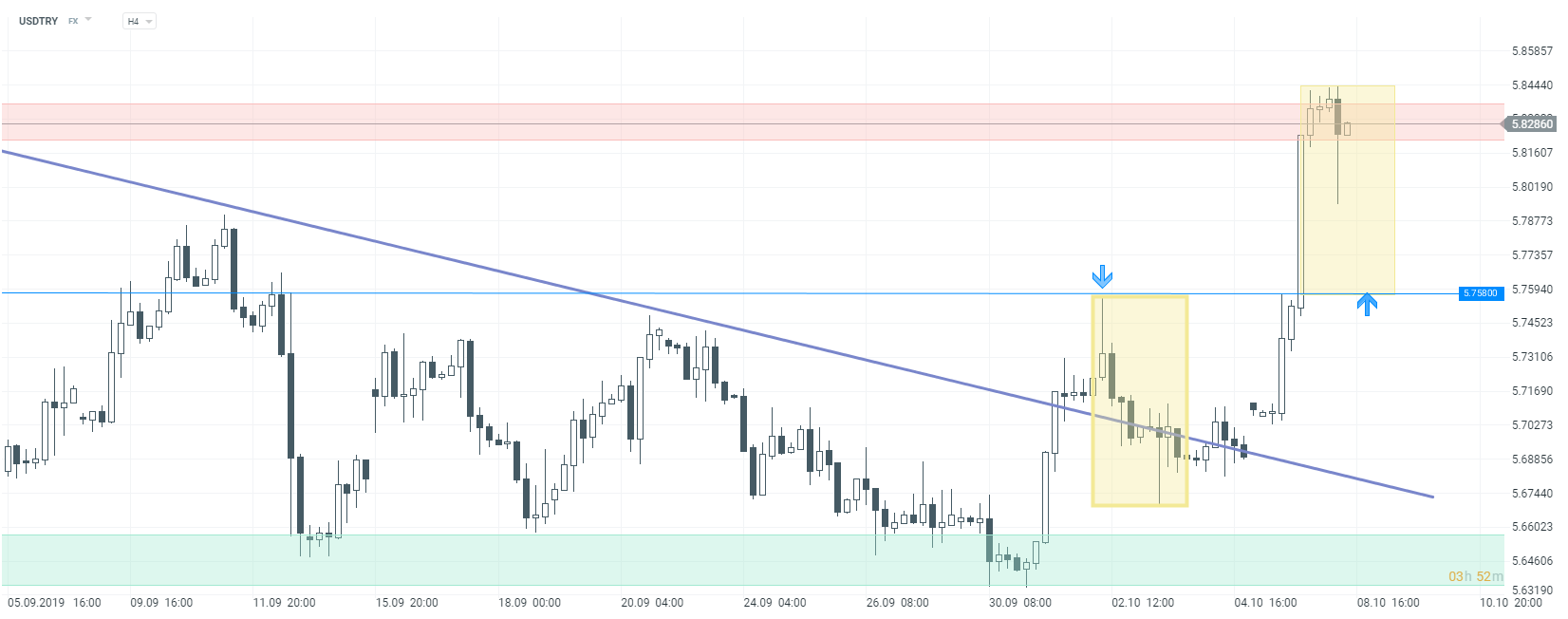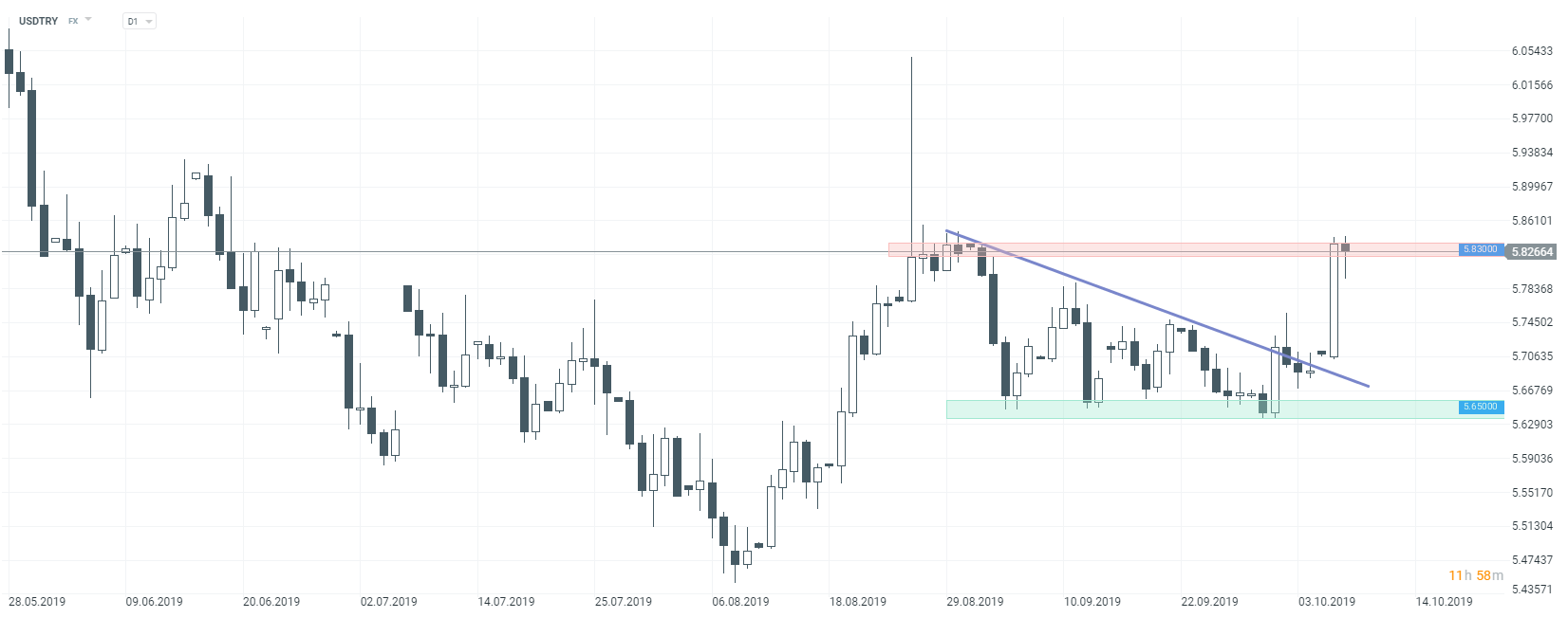 Trump skutkował Turcję i zapowiedział, że jeśli podejmie on działania militarne w Syrii to “zniszczy jej gospodarkę”, tak jak uczynił to ostatnim razem. Ryzyko polityczne ponownie wzrasta, zmienność na parach z TRY może być w najbliższych dniach podwyższona. Na uwadze trzeba mieć także sytuację Centralnego Banku Turcji, który być może chciałby w razie potrzeby reagować w celu umocnienia swojej waluty, jednak ma do tego ograniczone możliwości.