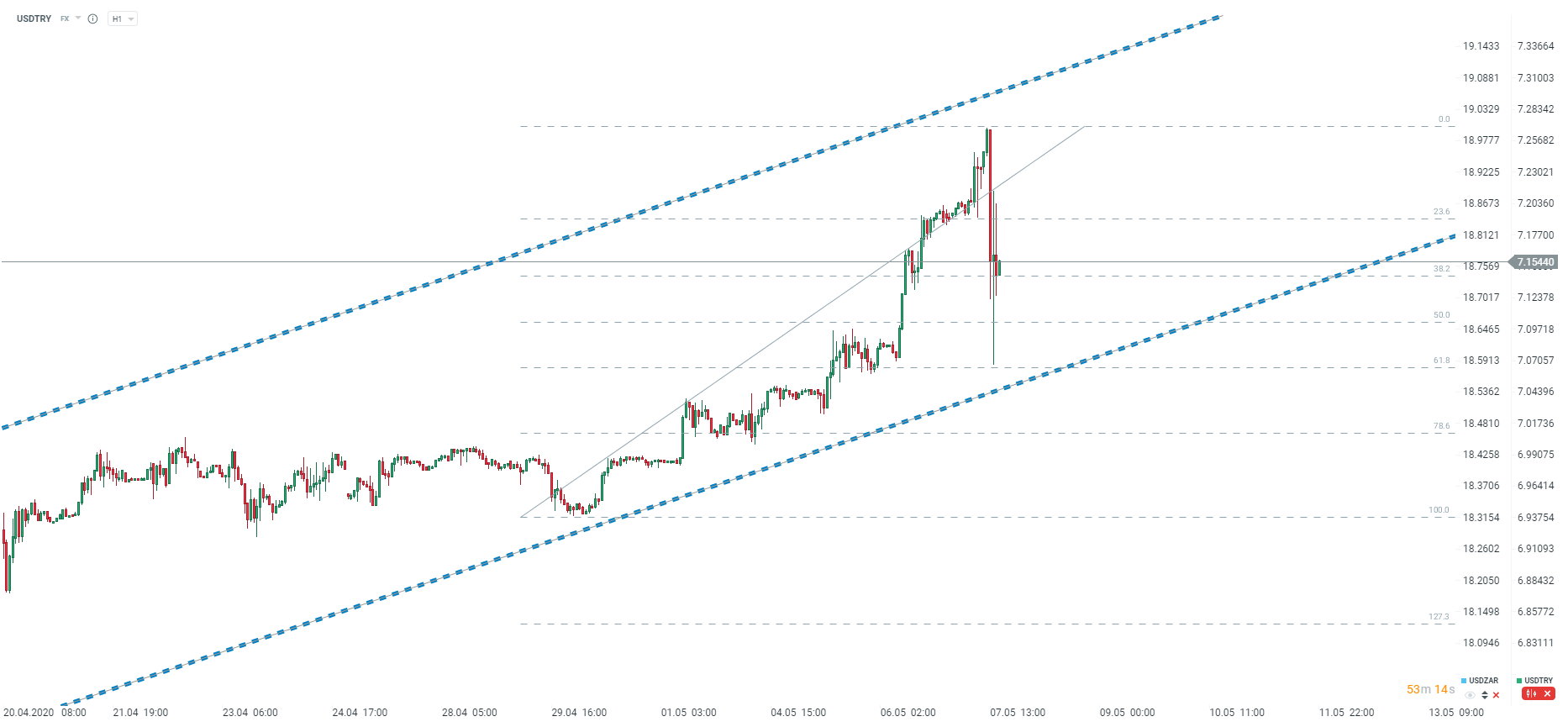 Dzisiaj lira traciła nawet 1%, a potem umacniała się nawet o 2%. Para spadła w przeciągu kilkudziesięciu minut z okolic poziomu 7,24 do 7,07. Obecnie lira odnalazła wsparcie w okolicach poziomu 7,1500. Para reaguje na zniesienie 50.0 oraz 61.8 ostatniej fali wzrostowej po konsolidacji, która miała miejsce w ostatnich 2 tygodniach kwietnia. Warto jednak zauważyć, że para porusza się w dosyć wąskim wzrostowym kanale trendowym od marca bieżącego roku.