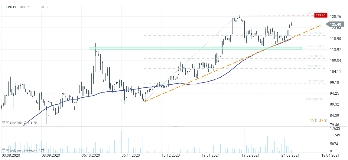 Patrząc na wykres dzienny spółki, kurs respektował w ostatnich dniach linię trendu wzrostowego poprowadzoną od 26 listopada. W marcu cena kilkukrotnie testowała 50-sesyjną średnią kroczącą, jednak bykom udało się utrzymać powyżej. Zwyżka z ostatnich dni może sugerować, że kupujący chcą ponownie dotrzeć do niedawnych historycznych szczytów (129,40 zł). Pierwszym wsparciem byłaby z kolei wspomniana linia trendu wzrostowego i 50-sesyjna średnia krocząca. Inne kluczowe wsparcie to okolice 114 zł (zniesienie 38,2%, lokalne dołki z marca i szczyty z października 2020). Można odnieść wrażenie, że do korekty rozpoczętej w drugiej połowie lutego przyczyniły się dynamiczne wzrosty rentowności amerykańskich obligacji, co doprowadziło do wyprzedaży spółek technologicznych. Warto brać ten czynnik pod uwagę analizując LiveChat Software.